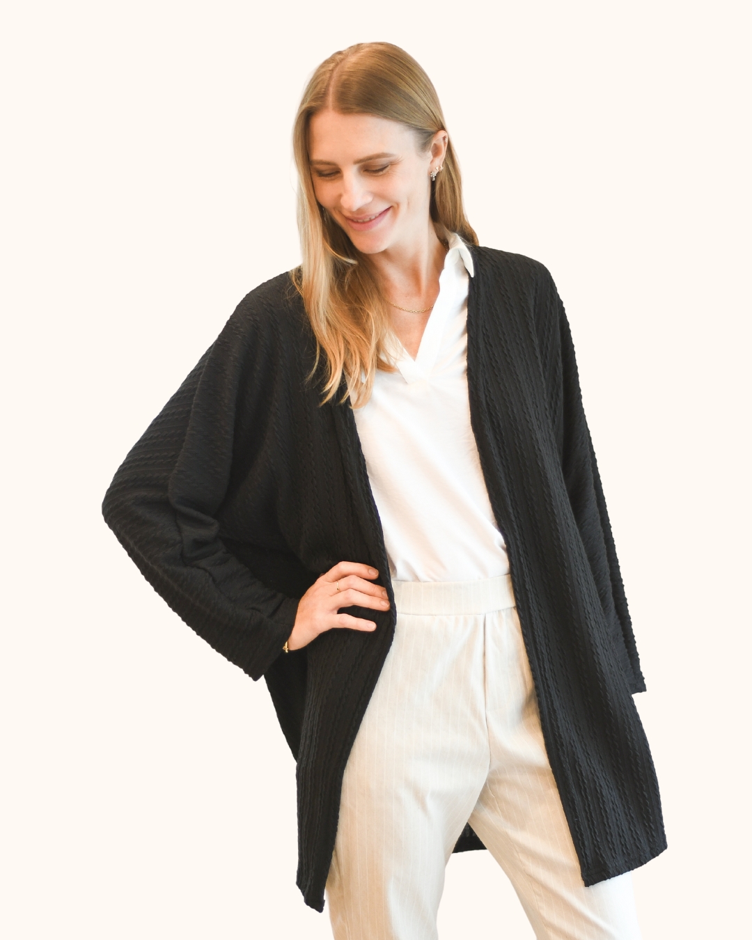 El toque perfecto de comodidad y estilo: Nuestro Cardigan Braids chompero oversize con textura de trenzas en colores básicos y tendencia.